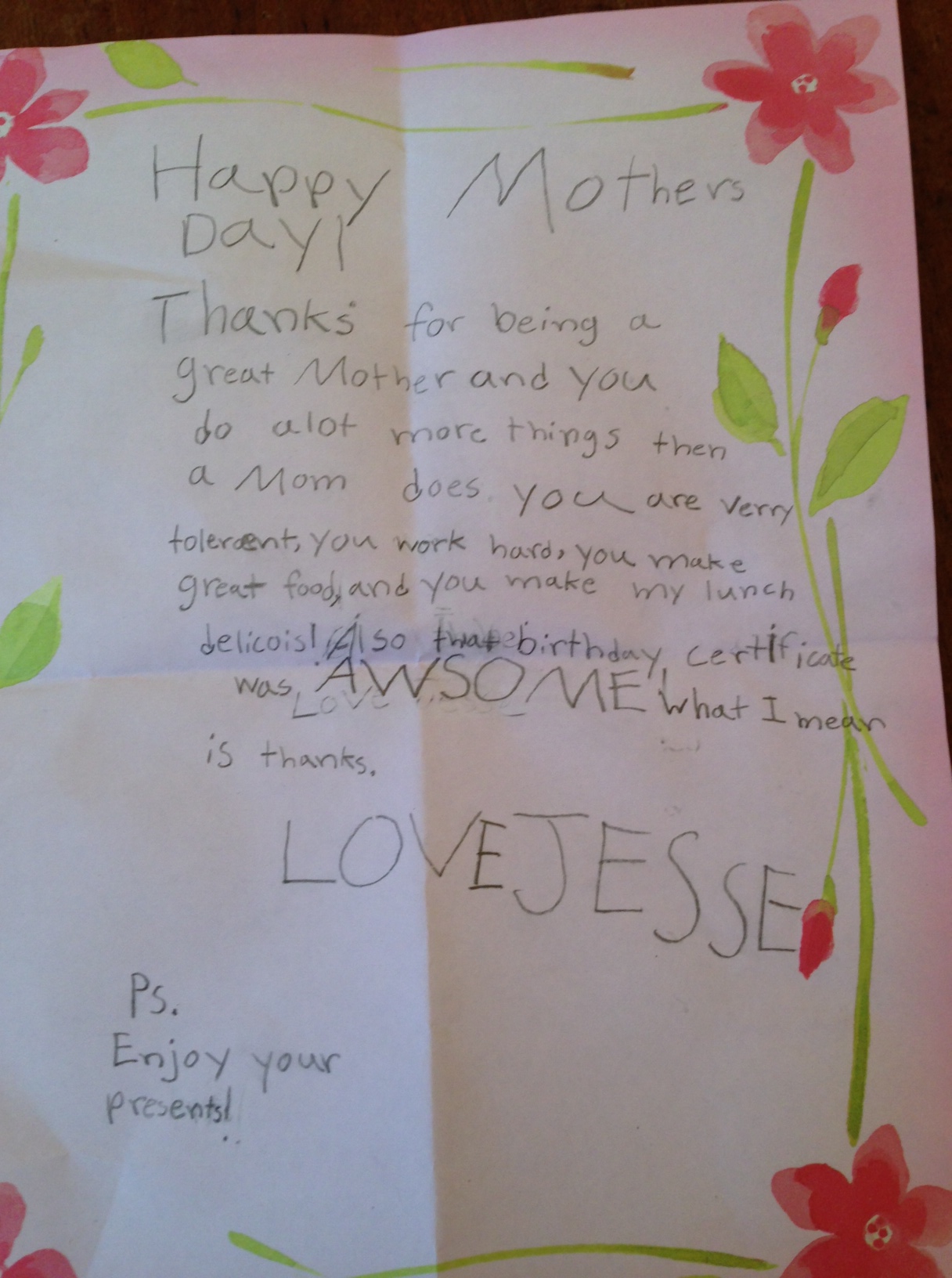 In case you can’t make out the body of the text: “Thanks for being a great Mother and you do a lot more things than a mom does. You are very tolerant, you work hard, you make great food, and you make my lunch delicious! Also that birthday certificate was AW[E]SOME. What I mean is thanks.”