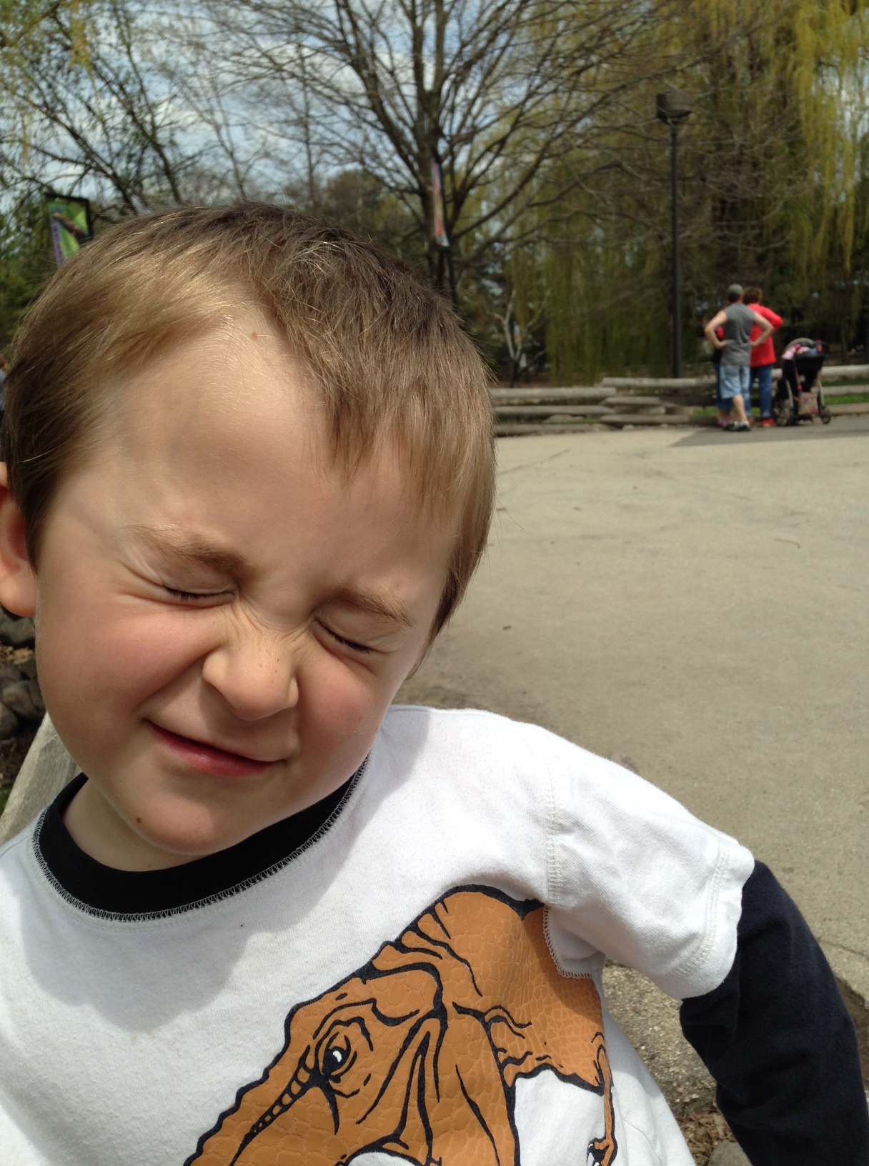 My Mother’s Day weekend this 2014 was a bit odd. Jesse turned 9 last Tuesday, and as part of her birthday gifts she got a “birthday certificate” sending her on an overnight trip to a waterpark with Dad. She and Anthony were gone Saturday and much of Sunday, so I got to have some alone time with my 4-year-old Nick. He wanted to be the boss, and that seemed okay. We relaxed together Saturday, running a few errands and buying a couple plants for the yard. Nick picked a lovely little shrub for me with wee white flowers. Perfect. Sunday we woke up and lazed about. I brought Nick breakfast in bed so he could do a mini-marathon of Digimon. Next he wanted to go to the zoo. I said yes, because it was sure to be a quiet day at the zoo. After all, what mother in her right mind would go to the zoo on Mother’s Day? It would be Nick and me, riding the little steam engine zoo train over and over again, and visiting quietly with the penguins.