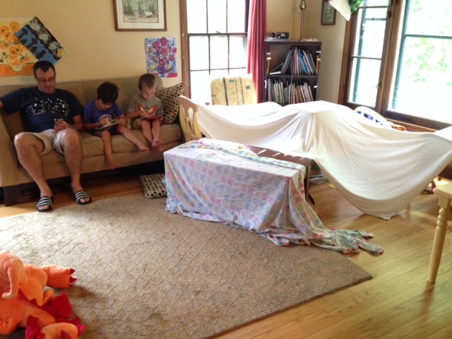 Who am I to say no? I gave him sheets. He and Jesse built a fort that took over half the living room and used all our small furniture and chairs as vertical structural elements. They completed it while Anthony and I were out on a date night enjoying the totally mediocre movie, Lucy. They filled the space in the fort with books, supplies, and stuff; and apparently if there was anything that didn’t fit, they threw it on the floor in the other half of the living room.