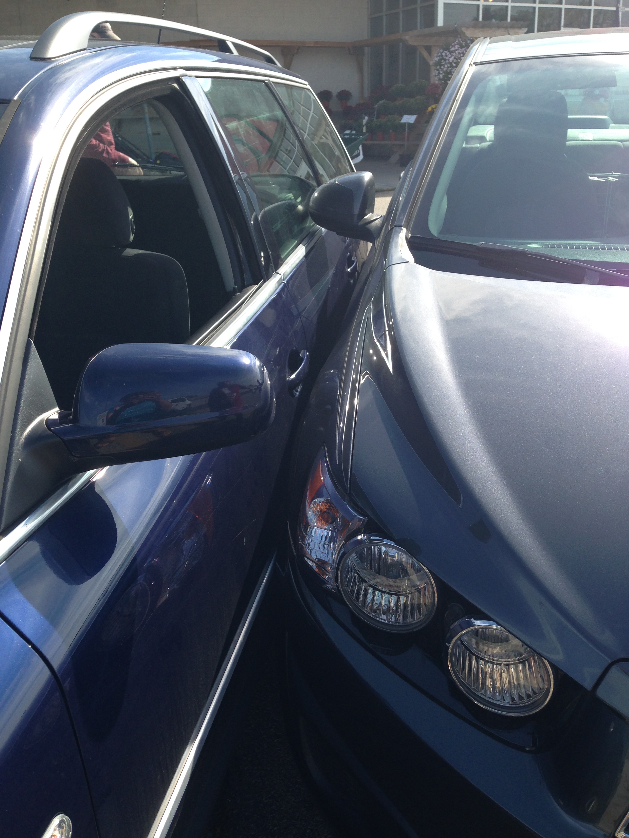 As I walked over with one hand under my jaw to keep my mouth closed, I observed the friendly car’s driver blithely closing her door and heading off toward the store. La la la. I stopped her. She tried to walk past me. I showed her the unusual proximity of our cars. She was a little hard of hearing but she finally got it. She said, “Oh. I was paying attention to the driver side to make sure I had enough room with the car on that side.”