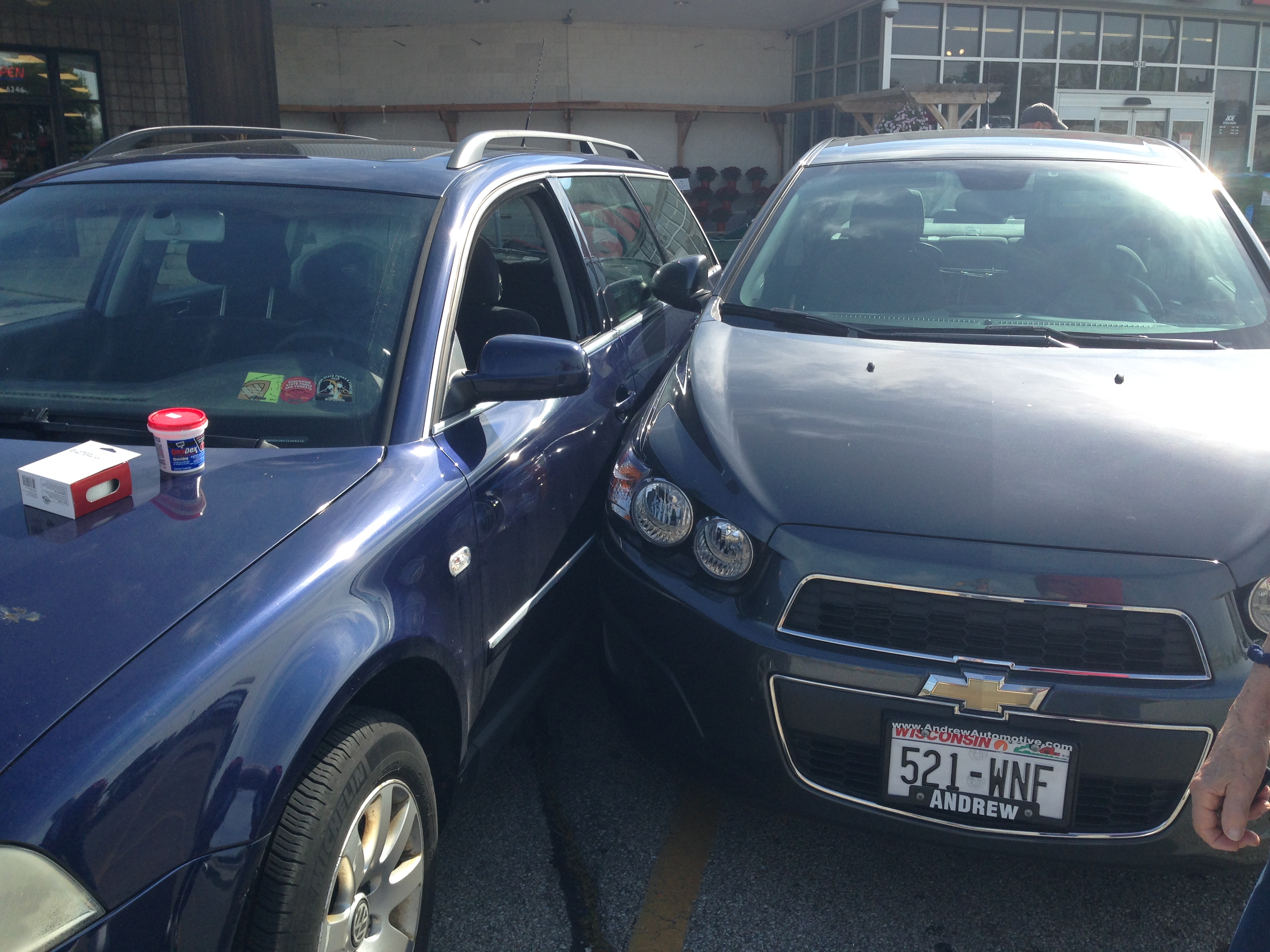 I called our little city’s non-emergency police number. As we loitered next to the cars, Ann fussed a bit and expressed a variety of concerns, but she was very pleasant. I told her not to worry about insurance until we saw how much damage there was when we separated the cars. After all, they were touching so delicately, like prepubescent teens holding hands. It occurred to me that we might just be able to get them apart without any major damage, but I wasn’t sure how. While we waited for the police to come, the blacktop got hot and Ann looked a little red. I suggested she take this opportunity to head into Ace and get her shopping done. She was happy to go. Meanwhile, I used my alone time wisely by taking photos and posting them on facebook.