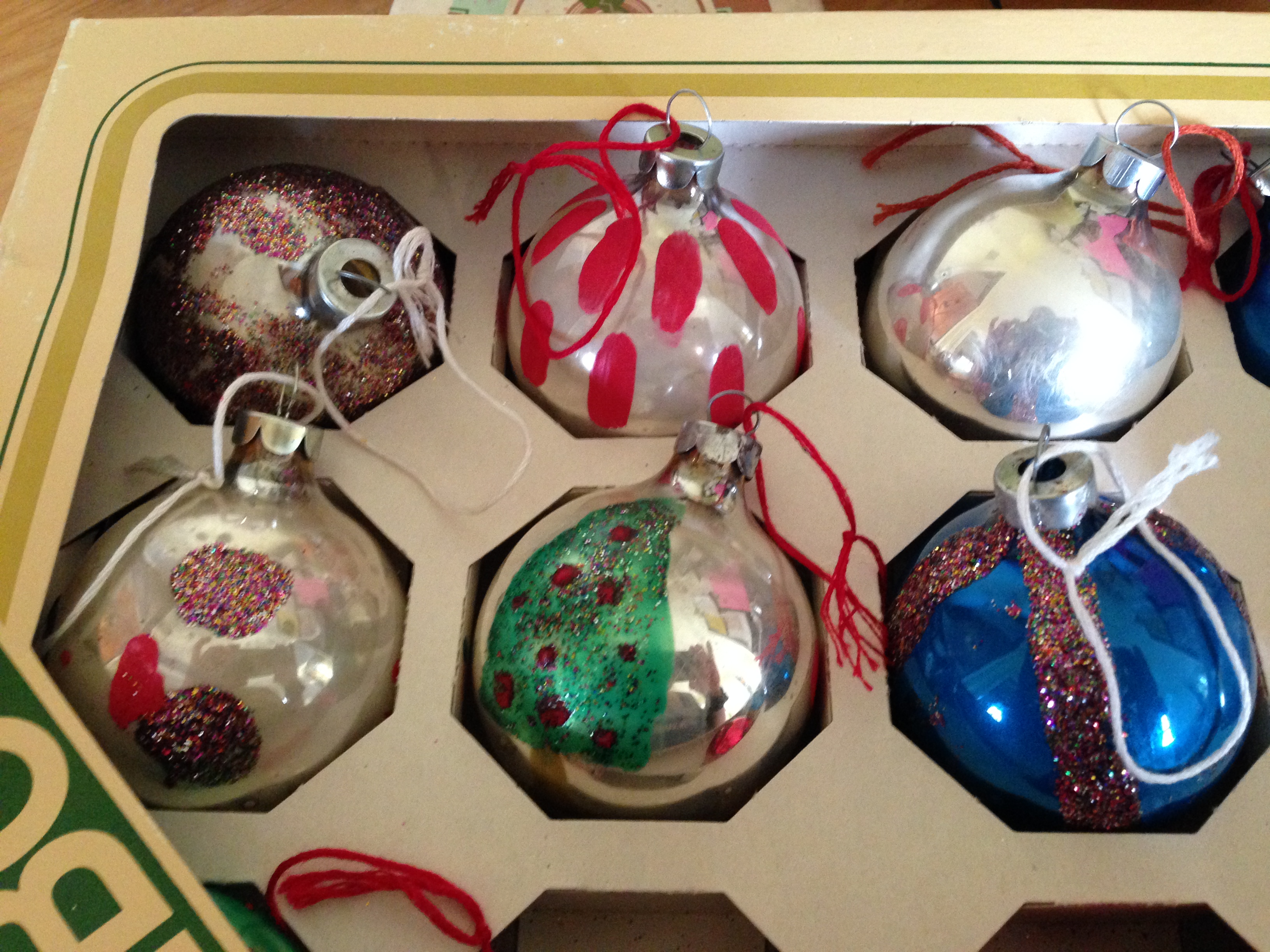 Here are some of the ornaments from the first tree Anthony and I ever shared, which I wrote about yesterday. This is a really good photo of them; they’re uglier in real life. We put them up high, right at the top of the tree where there’s almost no risk of breakage. I’m pretty sure they contain mercury, lead, and other toxic heavy metals.