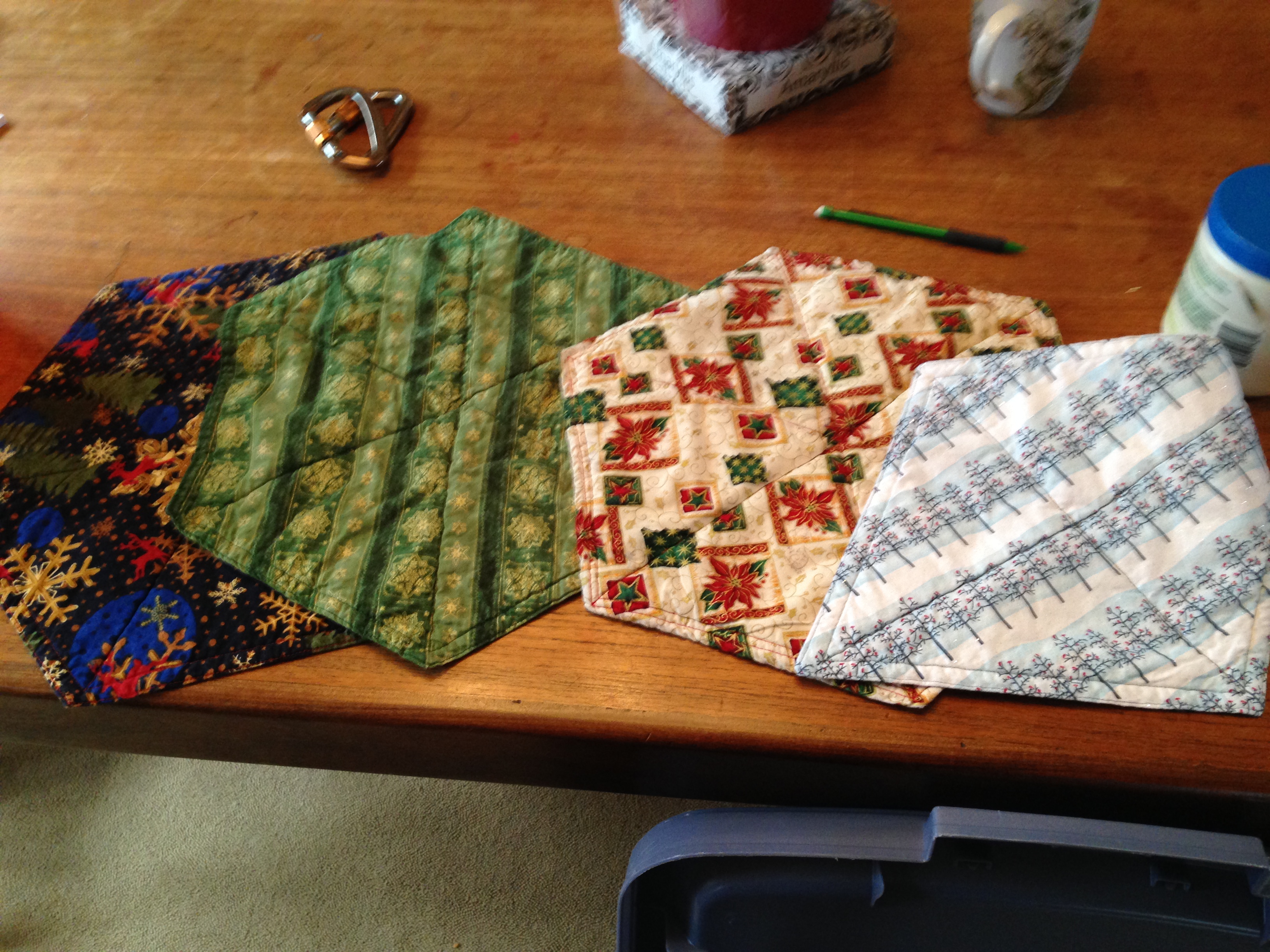 More trivets and cloth things I’ve made in Christmasy fabrics, because arts and crafts, yawn. I mean, yay.