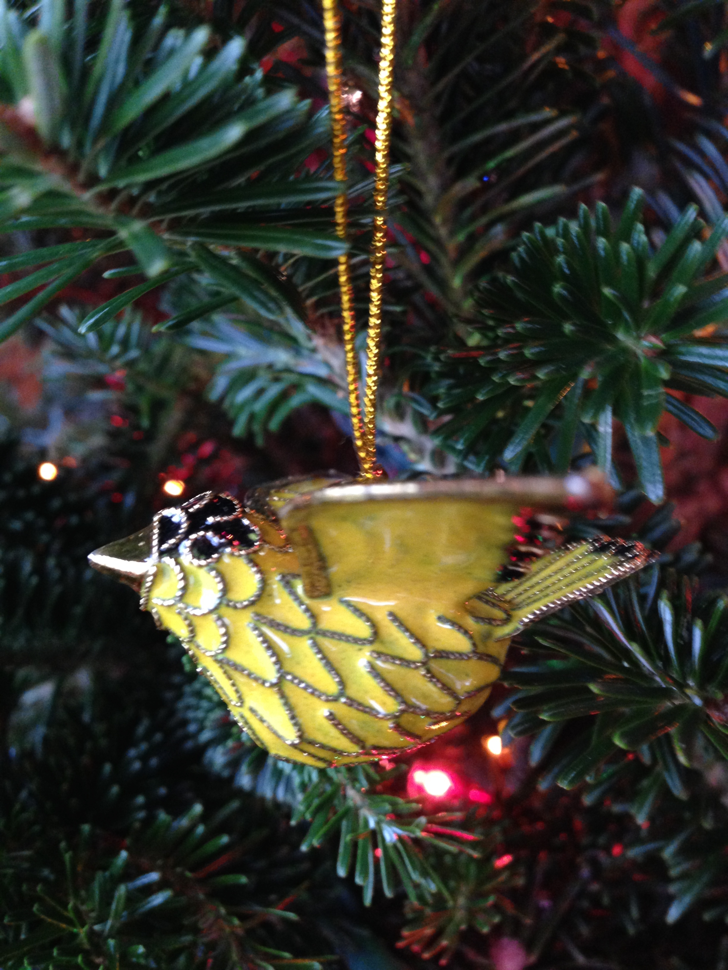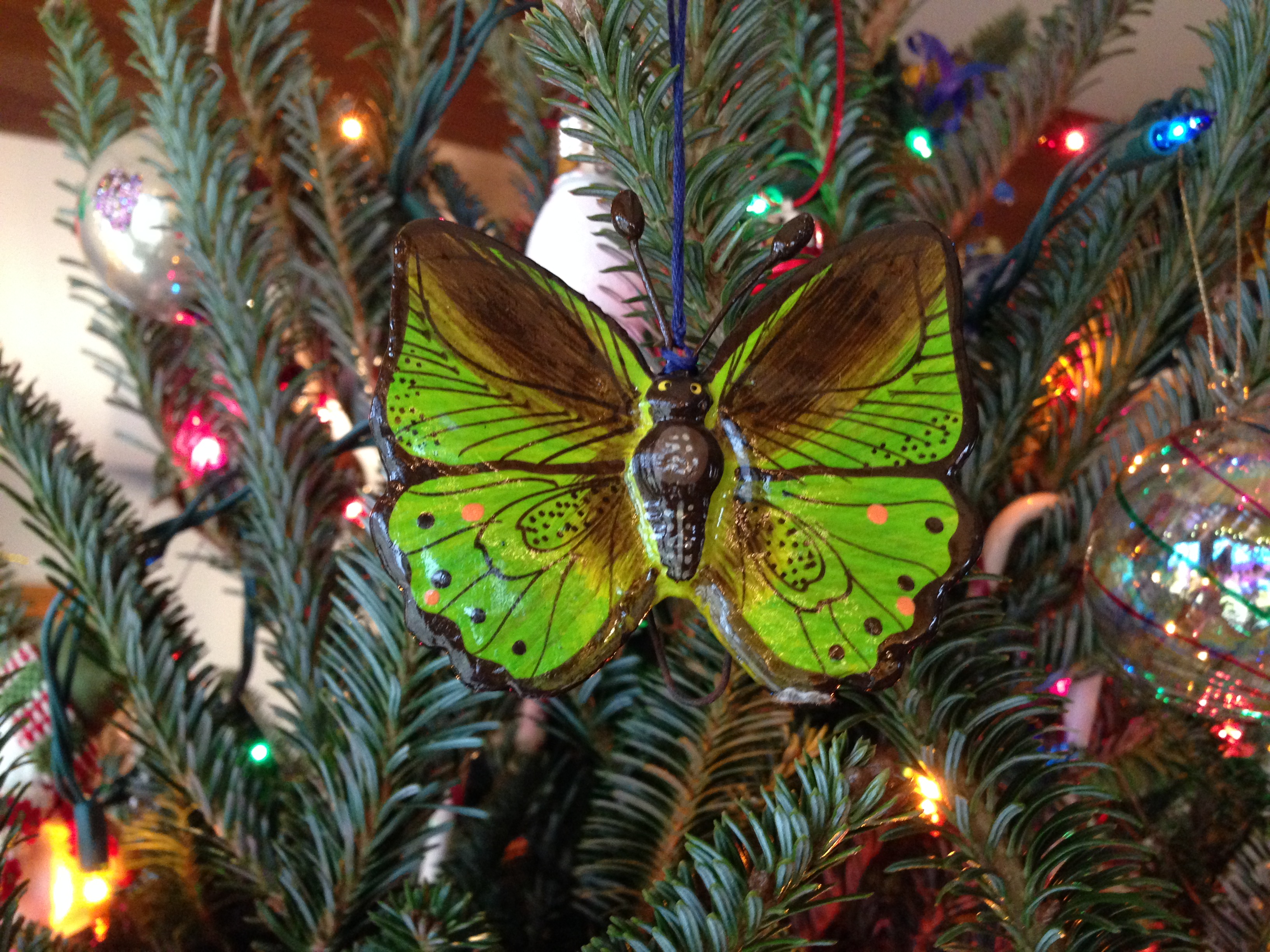 Here’s another of my favorites, a hand-painted clay butterfly (one of three) we received as wedding favors many years ago from a nice couple who married when we were still in Washington, D.C. There was a lot of salsa dancing at the wedding. They actually hired an instructor to help people dance during the reception. So Anthony and I did not dance. We slouched at our table and drank. We fell asleep while we were taking the metro home and woke up at the end of the line. I can’t remember if we were able to take a return train or if we had to catch a cab at that point. It was a long night. But we took home our butterflies. We weren’t sure what to do with them, but I rigged them up with some yarn and now we hang them on our tree every year.