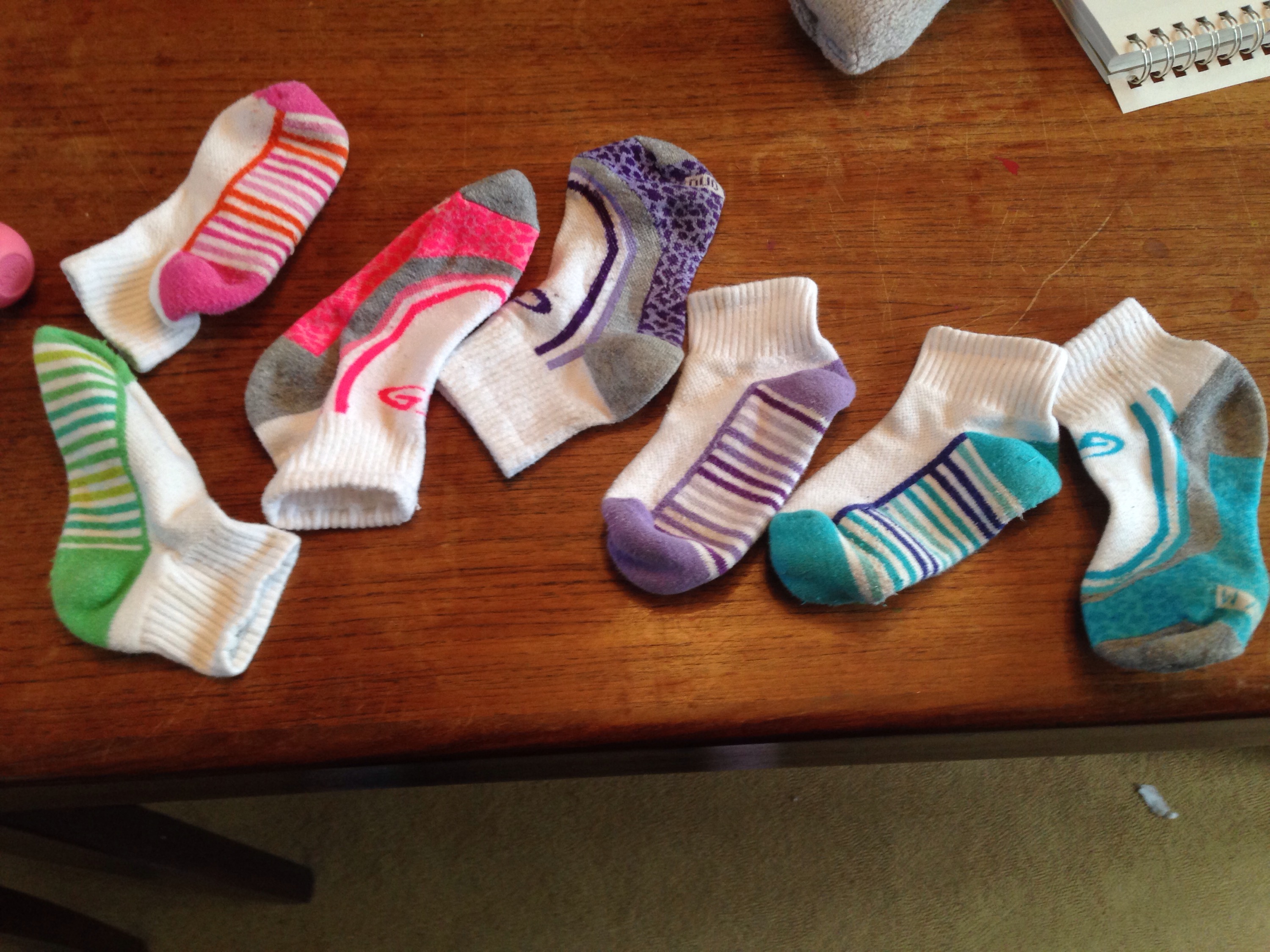 I dug down and hunted, finding one little white sock at a time. I kid you not, these are the socks I pulled.