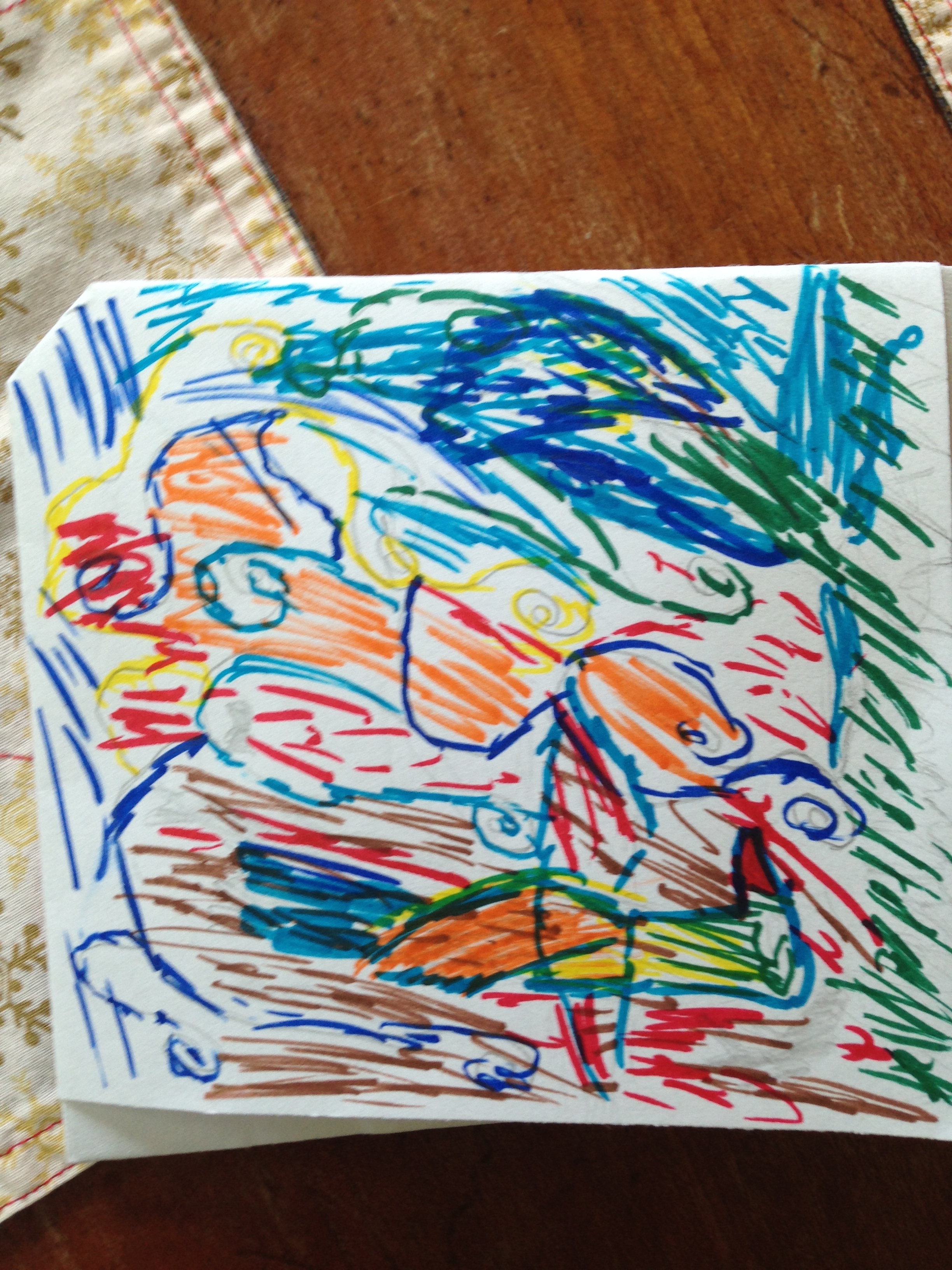 What the heck did she draw all over it?? Jesse doesn’t do random scribbles. She’s always trying to draw something. So I took a closer look at each of the four panels.