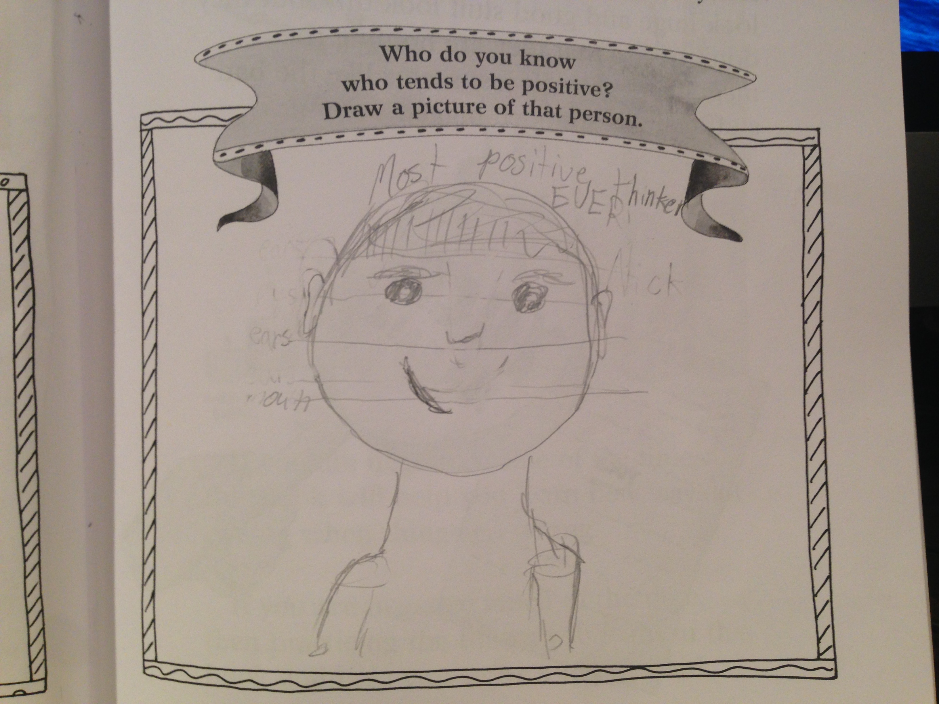 Oh. On the “who’s positive” side of the workbook, Jesse drew a picture of Nick with the caption, “most positive thinker ever.”