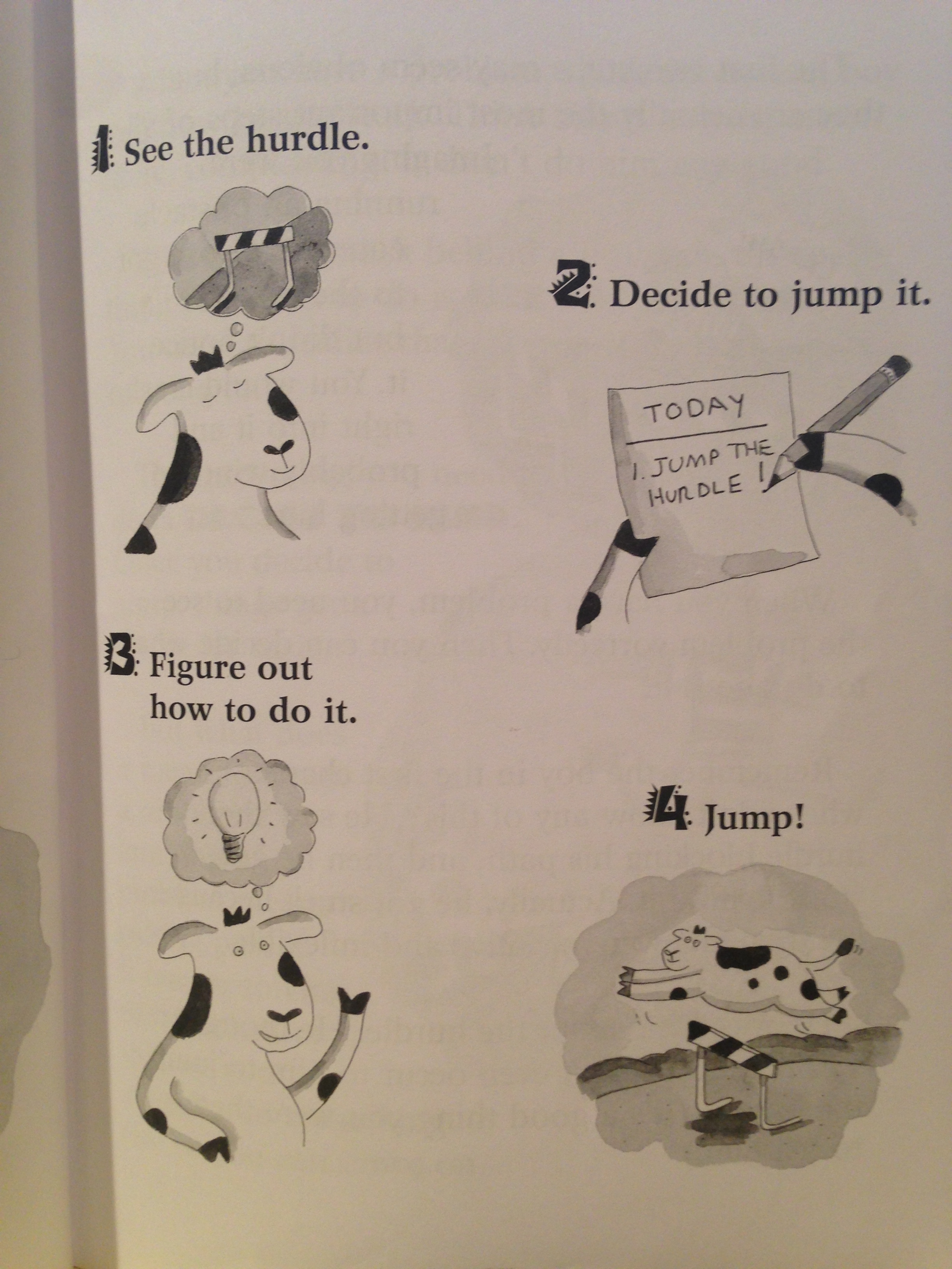 Four easy steps. Jesse read it a few times and pondered as we sat together. She wanted to know why the pictures showed a cow jumping hurdles. She looked at me curiously, expectantly, but then before I could say “It’s a metaphor,” she wandered off into her own mind and I left her alone.