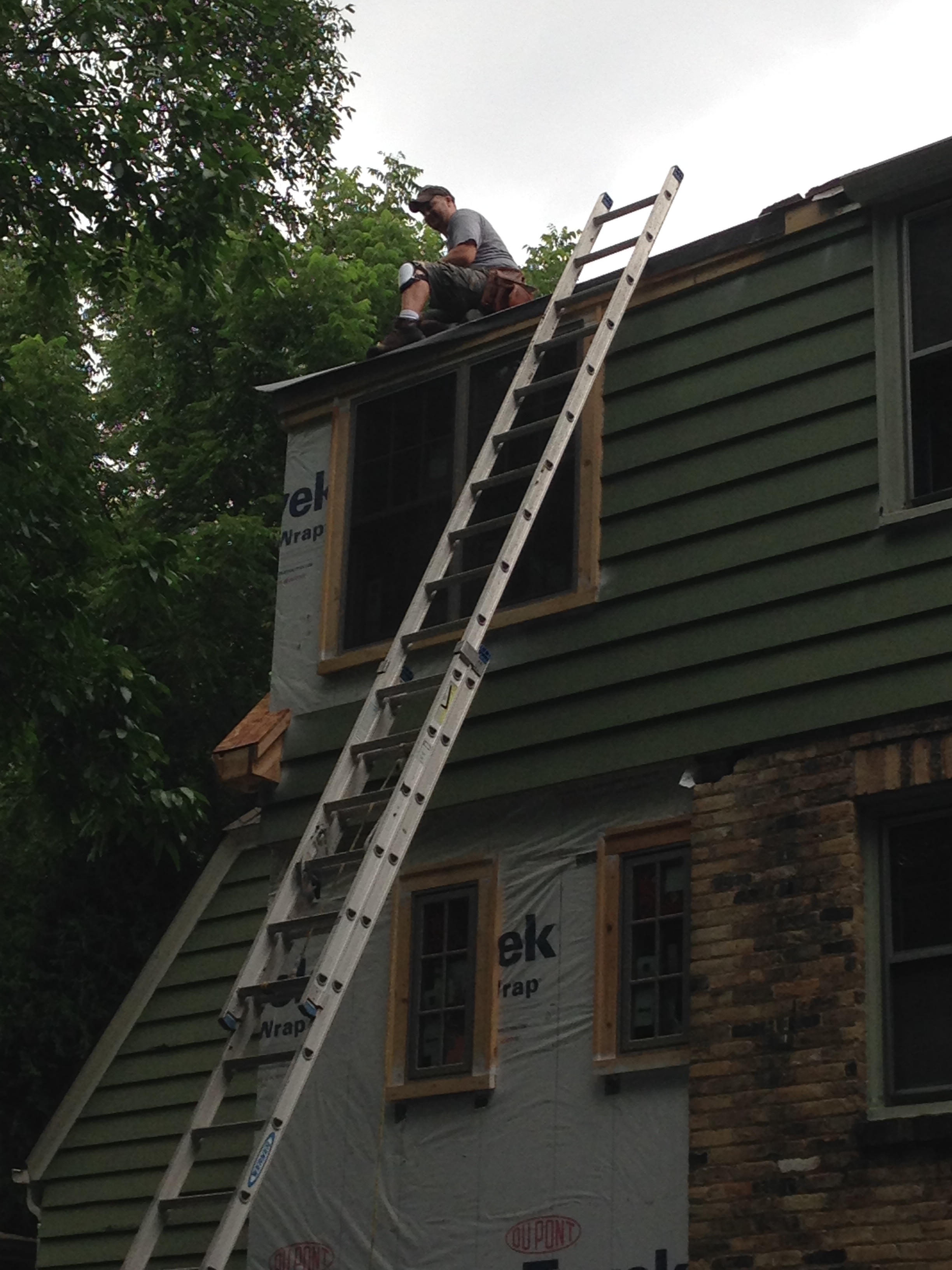 Here they are, Erick, Dan, and Talon, doing their thing. Three men and their ladders, not too macho to extend a loving hand to each other: