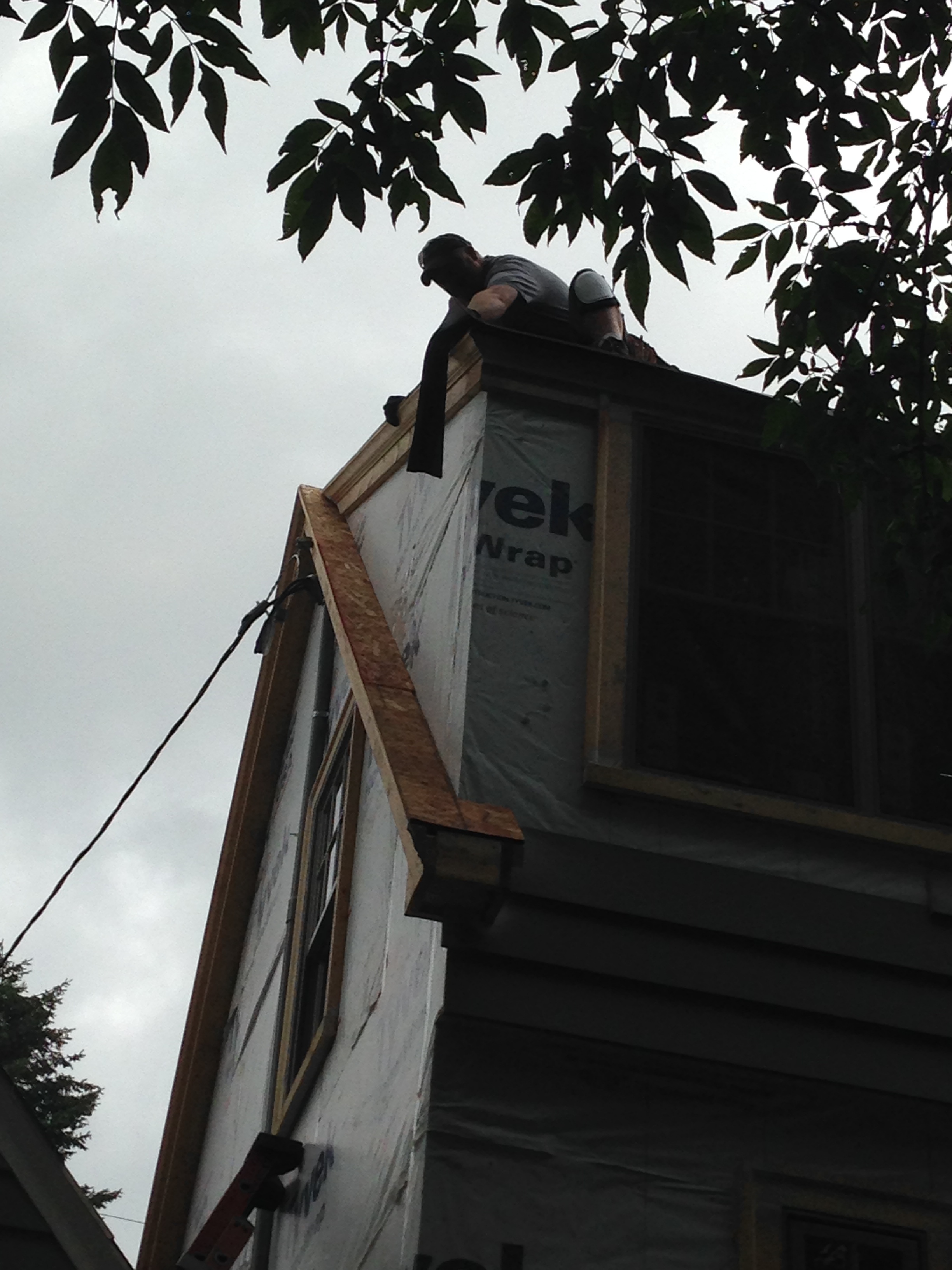 I caught the guys doing their daily Construction Pilates class this afternoon, even as they began installing the final layers of the roofing. Core strength is so important.