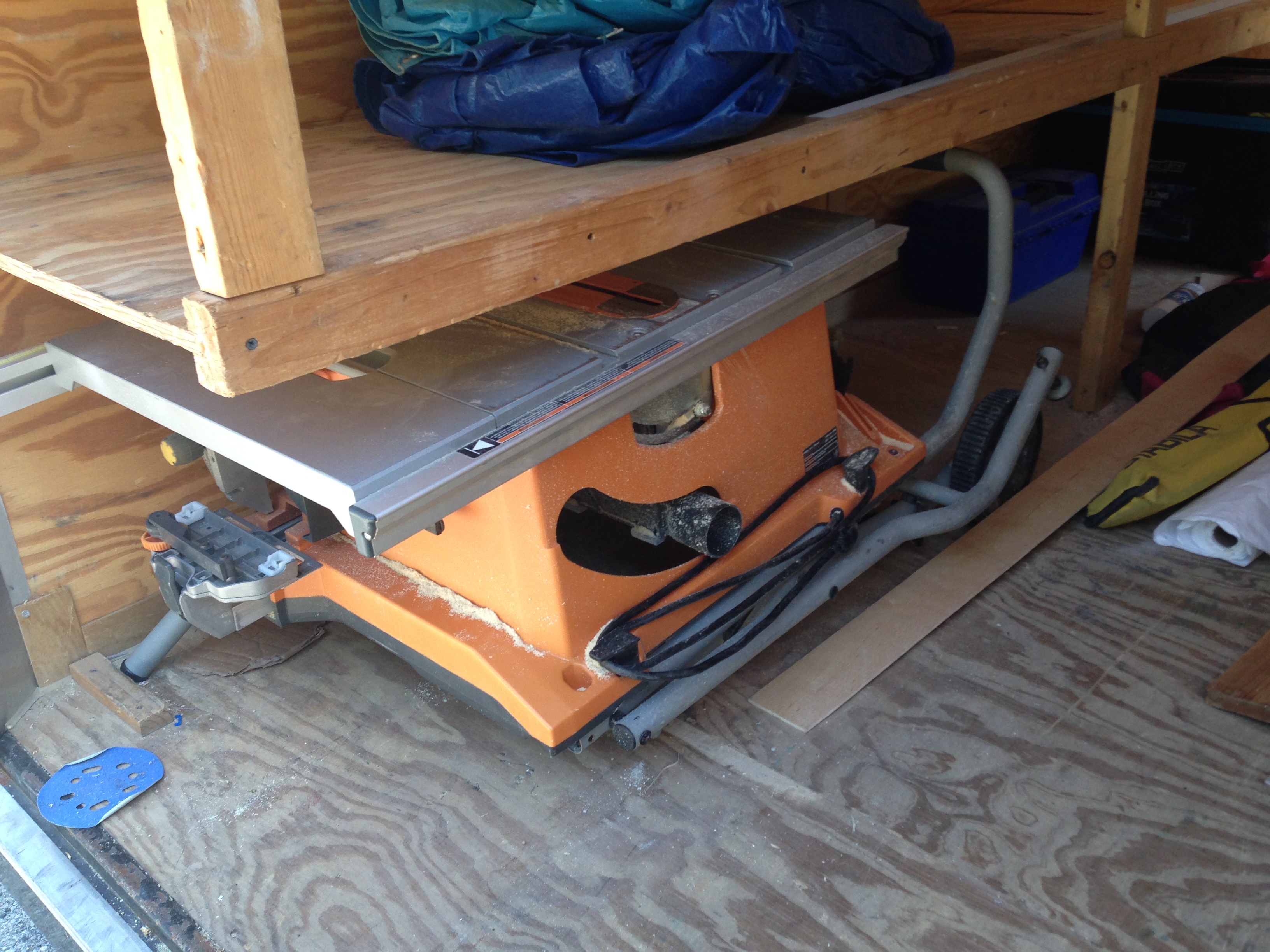 What is that little orange thing peeking from below the wood shelf in the totally cool and awesome trailer? Mobile table saw? Tiny planer? No idea. Want one.