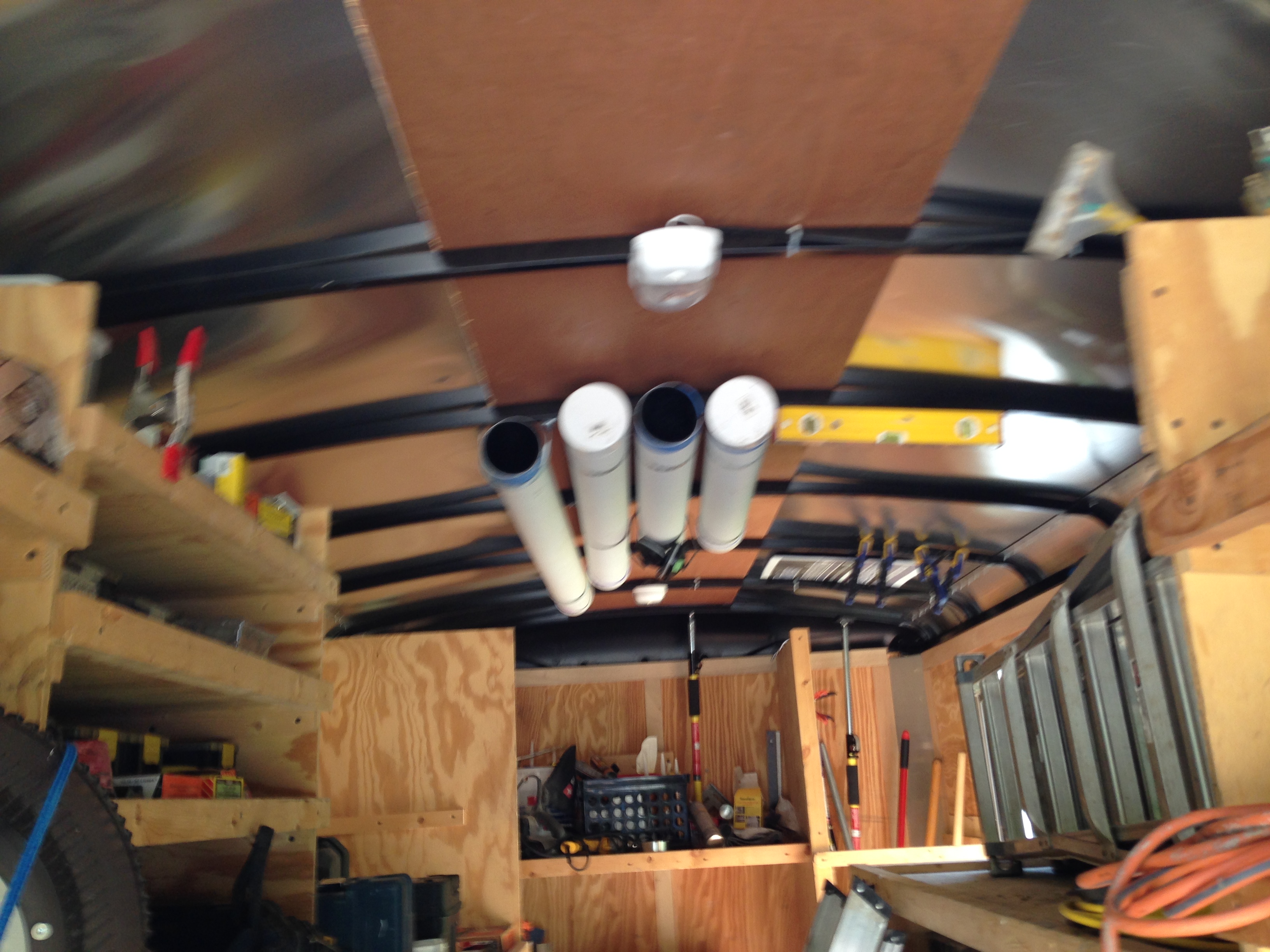 Erick did something inside the trailer that I consider to be very Martha Stewart: PVC pipes hung from the roof to hold things.  Awesome. Want.