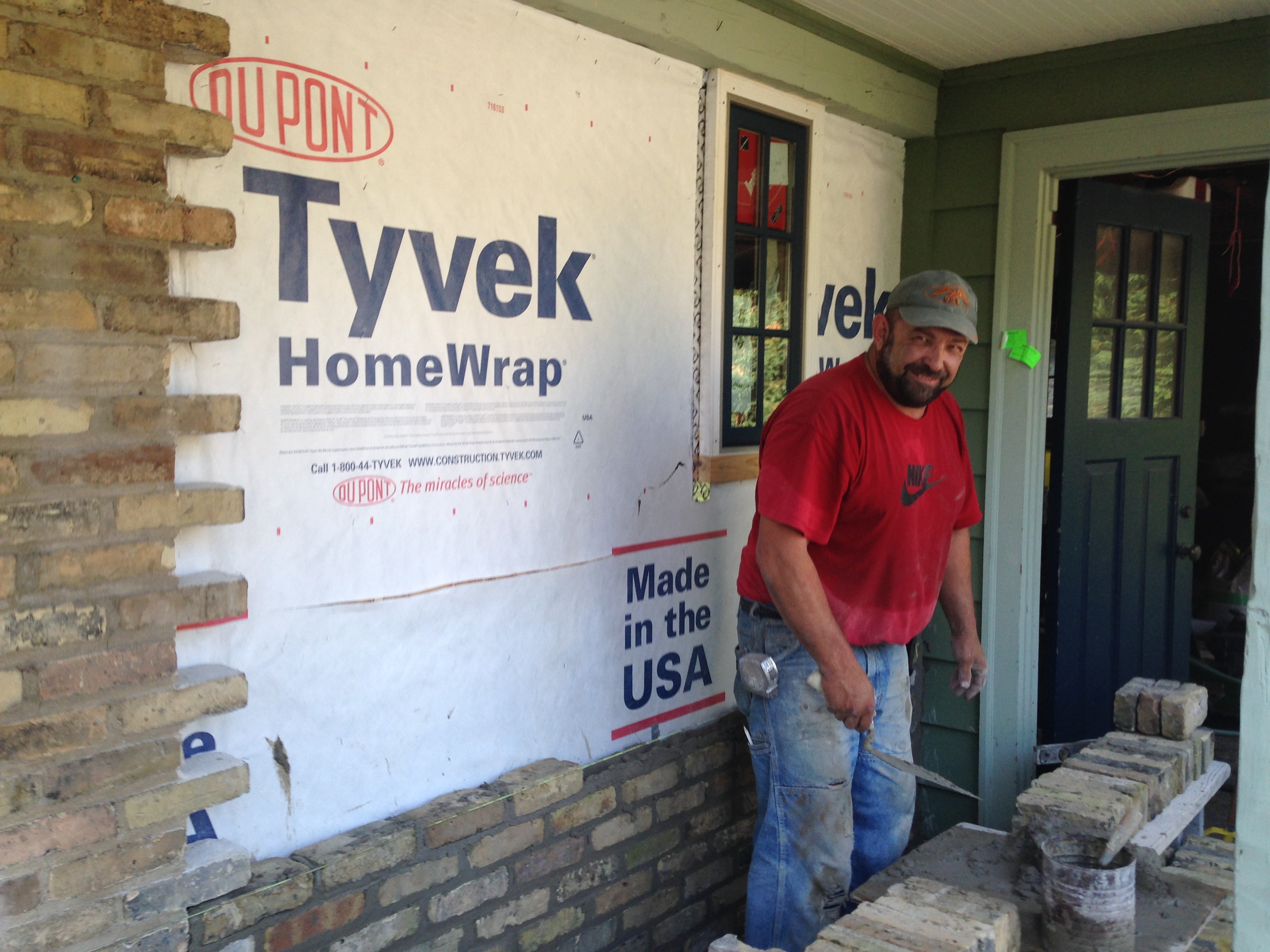 That space covered in Tyvek wrap is where brick went today. I sat in a chair nearby John and took pictures and watched him work for a good half hour throughout the day. He claims he doesn’t mind. I took videos and photos. It is an incredible art, what talented master masons do. John is a third-generation mason, and if you spend time with him, you can just sense that the craft is in his bones. He laid the entire wall with the help of a little level (which, as far as I can tell, he barely used) and a string. He didn’t need anything except his instinct to make the bricks plumb and level, and he placed them with careful attention to appearance and balanced tone.