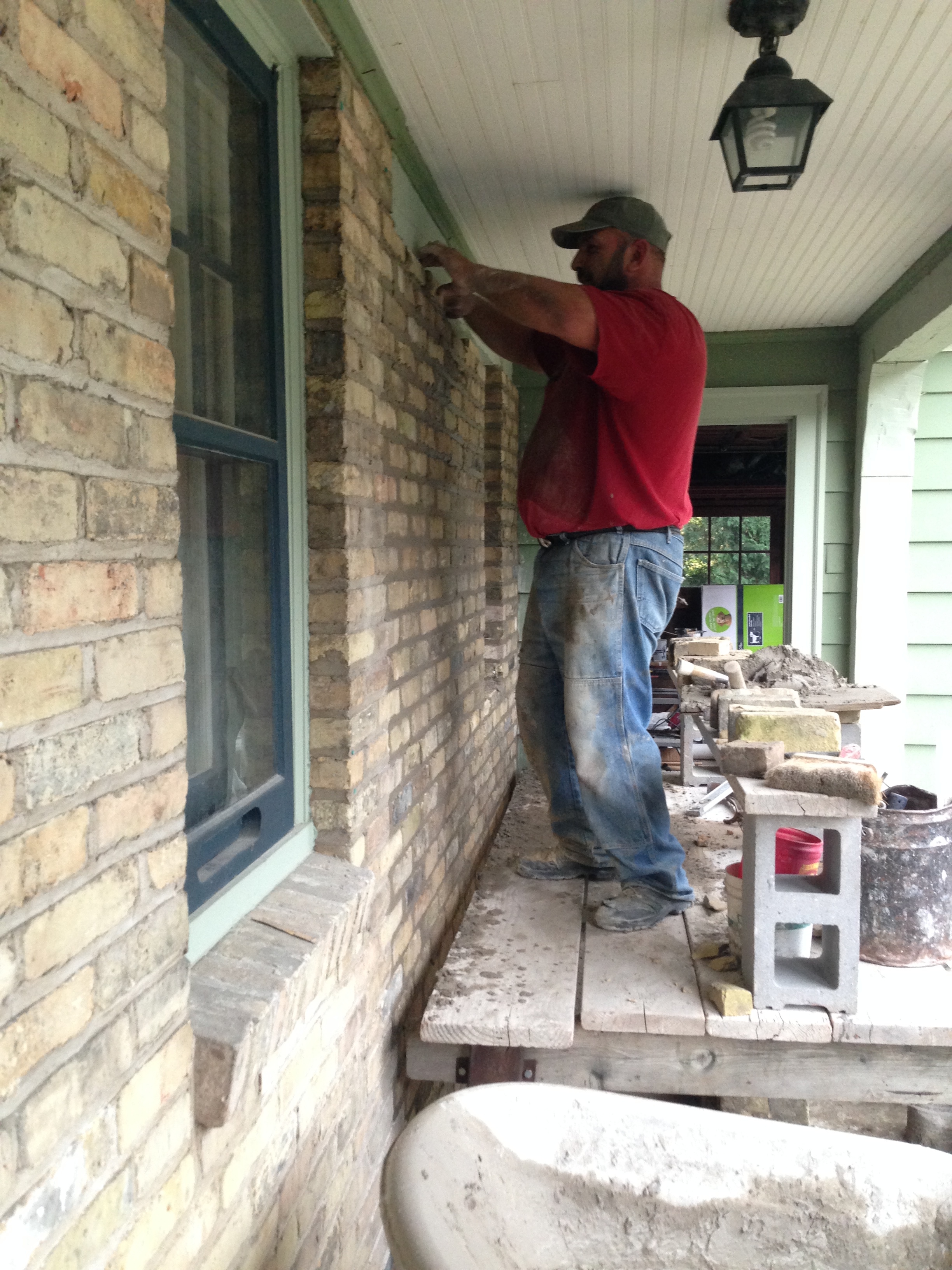He chatted with me as he worked. He talked about life, his family, his brothers, his work; and he taught me a little about his craft — how the bricks are laid and tied to the stud wall, how the mortar is mixed and handled, how to get it to stay on the trowel instead of fall off, why you leave a small gap between the wall and the masonry, on and on. I felt honored to sit and soak in some of his experience and wisdom.