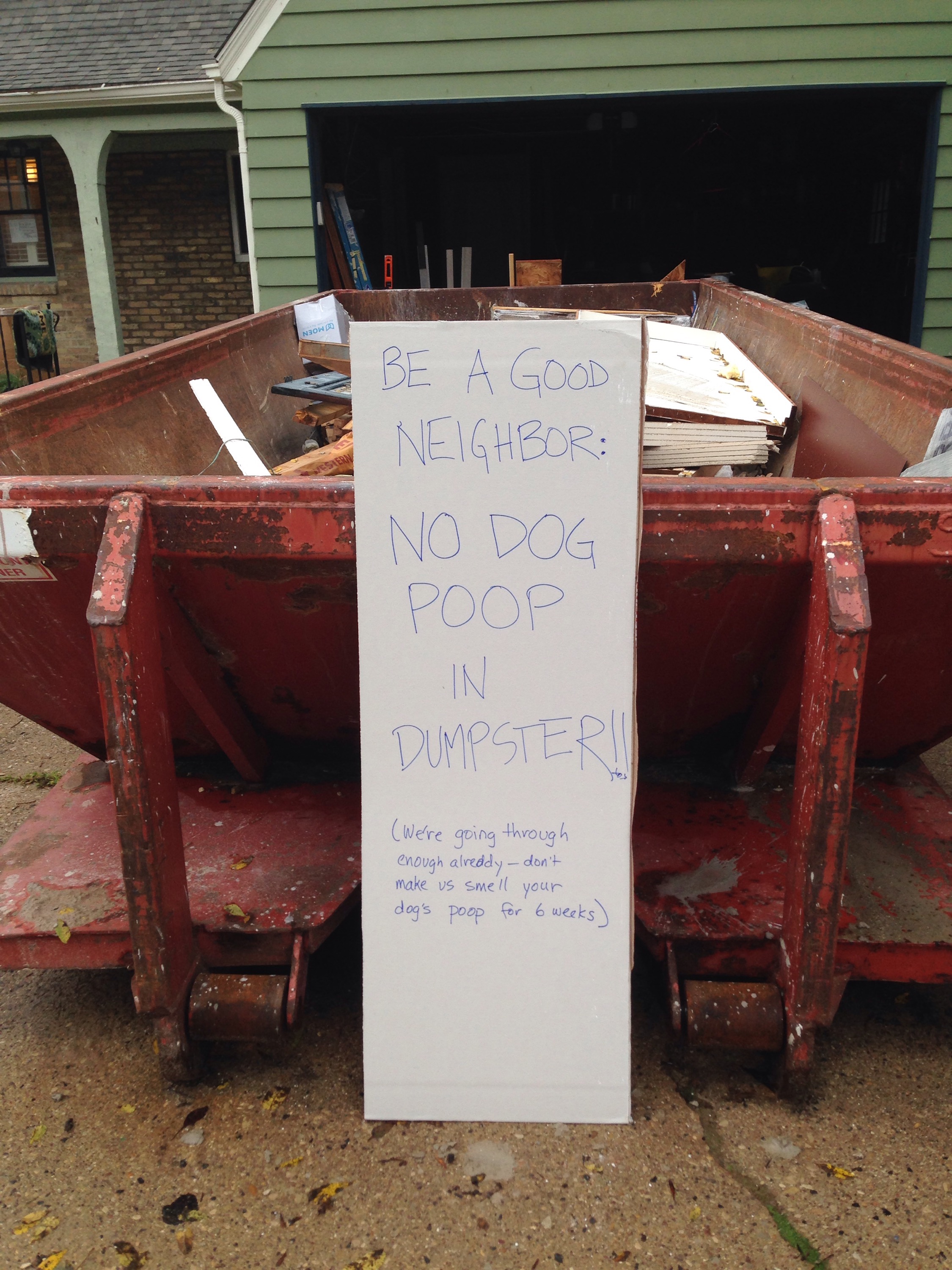 Please knock on my door the next time you fling your dog’s shit into my dumpster. We can chat and share a beer or two. Then I can oblige your shit-swapping habits and come take a dump in your front yard.