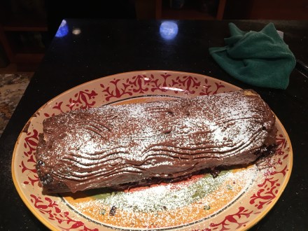 I didn’t make enough frosting. I didn’t know the log would be so huge. Still, I did the best I could. I just smeared it on until it was all gone. The ends and the bottom parts near the plate were bare. I figured it just made it more realistic, like a tree rotting in the woods.  I scraped the frosting with a fork to mimic tree bark, and then for authenticity I sprinkled it all with powdered sugar for snow.