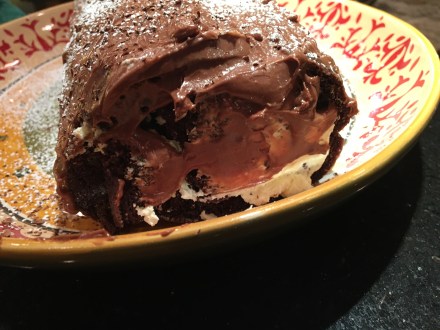 I baked a thin chocolate cake. As instructed, I rolled it in a powdered-sugar-coated dish towel to cool. I made a whipped cream filling, with a bit of insty-vanilla pudding thrown in to make it more sturdy. I made a thinnish chocolate frosting.